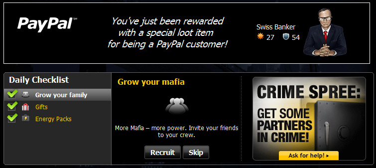 Zynga partnered with PayPal to bring a Swiss Banker in Mafia Wars. I know that majority of the players are irritated with the PayPal pop-up in game. Maybe this is one way to lessen the players’ anger towards that PayPal and Zynga.