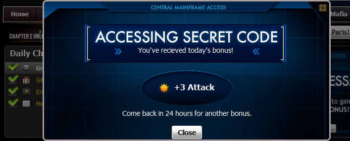 To go to the Central Mainframe, just go to the home page. You’ll find the Central Mainframe Access in the Daily Checklist. When I entered my code today I got +3 Attack. I don’t know if this is random or constant with every player today. Can you tell us in the comment what bonus you got today to know if this is random or not?
