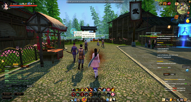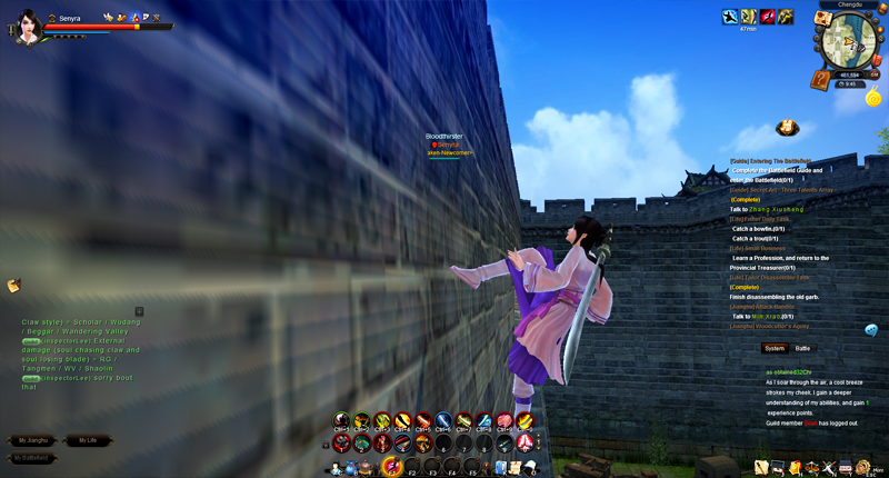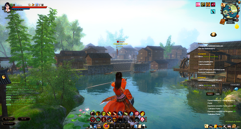 The game attempts to recreate China in many aspects, everything in this world resembles Asia and its sensations. The martial arts dojos, the extended wood bridges over lakes, the blossom trees; everything has been carefully constructed to shape a fictional world where the occident has absolutely no place. The characters follow the exact same trend with typical Asian costumes, emblematic oriental hairstyles, traditional weapons and mythical Kung Fu moves. Climbing interminable walls and walking upon water is now a possibility; defying gravity is one of the main attractions of this MMO.