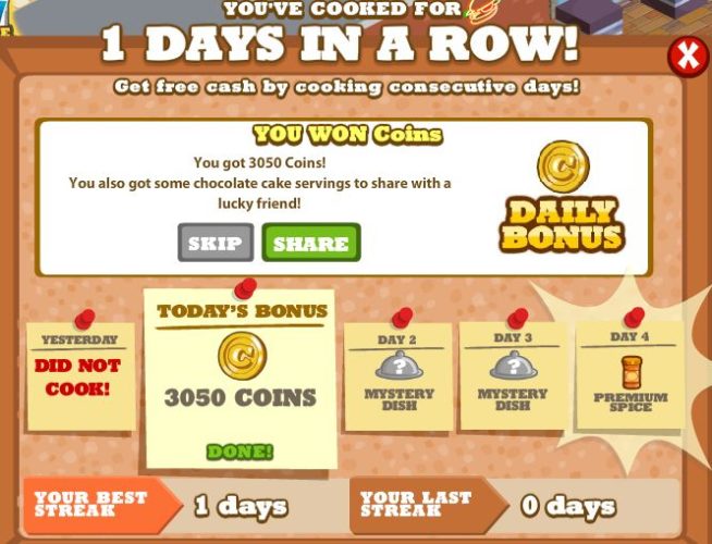As you can see in the image (click to enlarge), the daily bonus is received on a per-five-day cooking streak and you can only win coins (the first two days), mystery dishes (the next two days) and, in the last day, a Premium Spice.