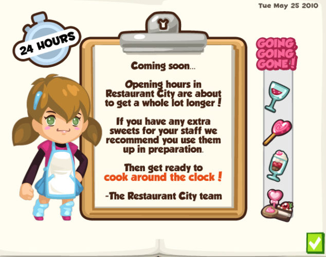 Now an in-game pop up announces that Restaurant City will introduce longer opening hours soon. Will this mean that waiters can now serve up to twelve hours before they get tired?