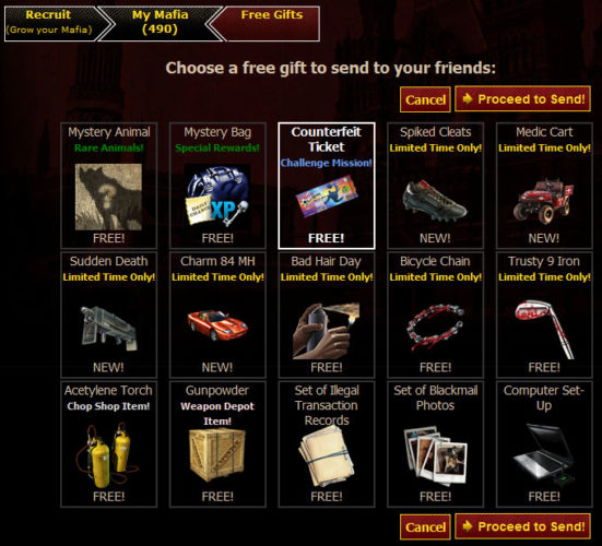 Zynga now gives you the opportunity to give out Counterfeit Tickets through the Free Gifting page. You can send one to forty of your mafia members daily and hopefully at least five of them gives one back. You can only receive five Counterfeit Tickets in a day.