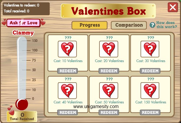 The official description explains: “Send and receive Valentines and then trade them in for Limited Edition Valentine’s Day decorations! Compare your Valentines collection to your friends’ by visiting the Comparisons page. Can you collect more than they can?”
