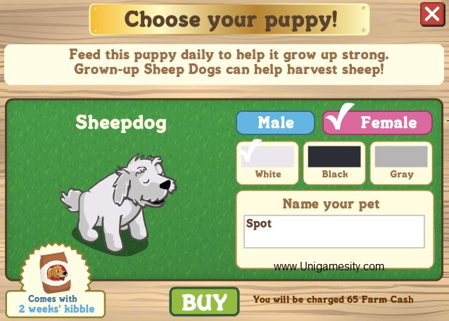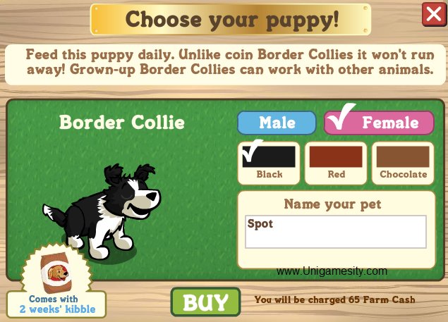 What matters is that your puppies must be fed on a daily basis with Puppy Kibble for 14 days – after this period they will turn into adults. As said before, the Border Collie will run away if you don’t feed it every day, so you might want to be sure you can log in at least once per day for the next couple of weeks if you get one! Also, before buying your dog, you can choose its color, name and genre, which is a nice touch from Zynga!