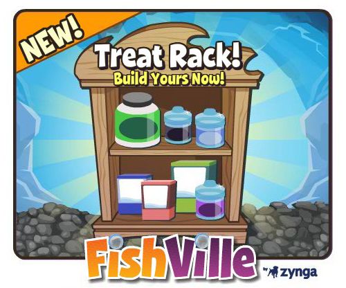 Well, it is a new item you have to build with the help of your friends. Once built, the Treat Rack will hold some really cool FishVille “treats” – special foods that will help you with the fish growing, XP gatherting and so on. You can get these treats for cash or Sand Dollars, but either way you need a complete Treat Rack to have access to them!