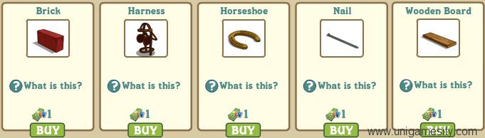Alternately, you can purchase the above mentioned components for the Horse Stable from the Market, under the “Buildings” tab. Each of these costs 1 FV cash, so you would be spending 50 FV cash to buy all of them from the market: