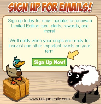 First of all, let’s see how to sign up for FarmVille email updates! You will have to log in to your FarmVille account and click on the “Love FarmVille?” tab in the upper side of the game screen (near Zynga’s logo). There you will see an image similar to the one in the left corner (click to enlarge) and you’ll have to click the Sign Up Now button, then confirm your request.