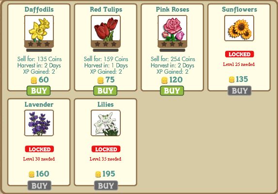 Starting right now, you can purchase Daffodils, Tulips, Roses, Lavenders and Lillies from the Market and you have a screenshot of the flowers in the upper left corner, if you wish to check them all out. The flowers are rather expensive to plant, but I believe that the profits are really nice – so it appears at a first glimpse…