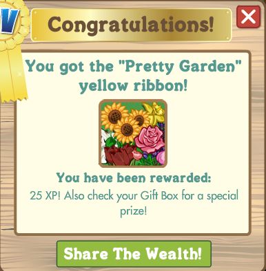 First things first – as you can see in the image to the left (click to enlarge), the pretty garden ribbon appears to those who have harvested a perfect bunch. You earn the first yellow ribbon if you place five perfect bunches on your farm and the last one – the red ribbon is won after placing 50 perfect bunches on your farm.