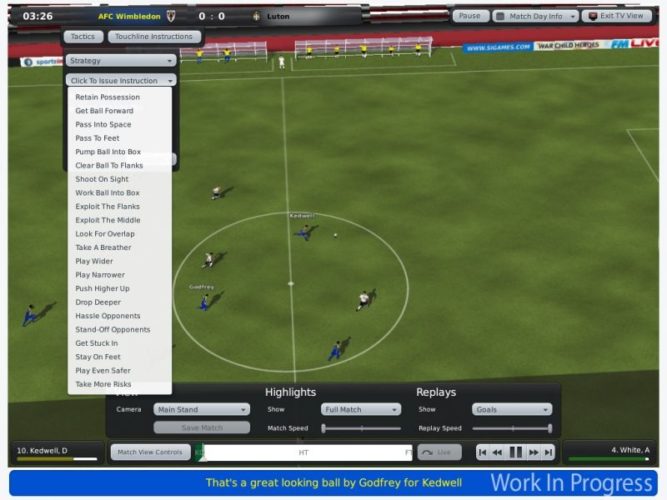 Another reason to switch to the 3D mode is the introduction of sideline instructions – a bunch of commands that can be “yelled” at your players during the match. Therefore, you can instruct players to pass more to the flanks or shoot on sight, to defend deep or push up, to try low crosses and so on. To be honest, I haven’t seen the impact of my instructions and I rarely had the impression that the players listened to me, but I am still an inexperienced manager and they probably don’t trust me enough. Joke aside, there’s also a new “shortcuts” button on the match engine that will allow you to quickly change to various presets without having to pause the game, go to the tactics screen and waste a lot of time in the process.