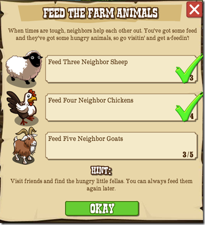 As you can see the two goals require you to feed your neighbors’ animals. The fastest way to complete these goals is to have a lot of neighbors in Frontierville.