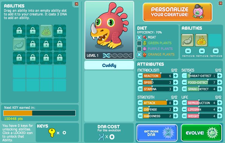 When the game first starts, you will have to create your creature by selecting a few attributes. These are divided into four categories: Metabolism, Senses, Strength, Life. Each has its own subcategory, like Speed, Stamina, Threat Detect, Attack or Defense and so on. Depending on the stats of your creature, its shape will change but it will still always look like a happy, cuddly pet. Which might not be the case for all creatures – as it stands for my ferocious attacker I’ve named “Cuddly”.