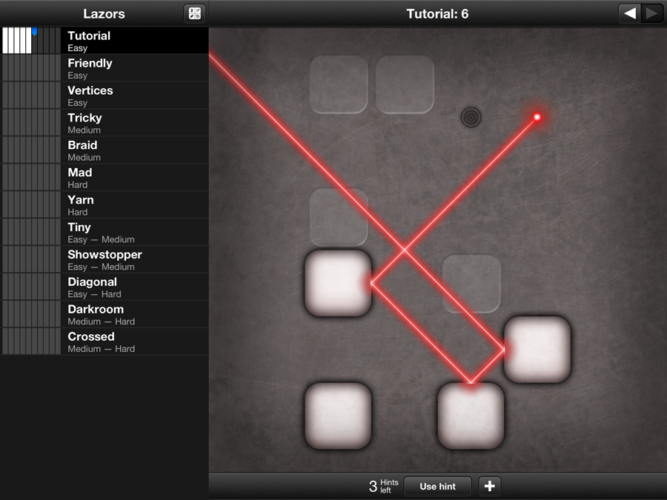 Lazors is a game that tasks the player with rearranging reflective blocks to cause a laser to hit a target. That’s basically it, but what it lacks in depth, it makes up for with thoughtful puzzle design that can become quite challenging as the levels progress. Things also get a little trickier when other types of blocks are introduced such as stone and glass. Stone blocks stop the laser from continuing on so you have to work around them, while glass blocks split the laser into two separate beams. There are also blocks that are bolted down and cannot be moved; these can simultaneously hinder and help you and its clear they are thoughtfully placed to this effect.