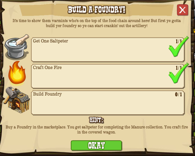 As stated above, Part 1 of the Varmint Cannon Goals is Build a Foundry. This goal requires you to get one Saltpeter, craft one Fire, and finally build your own Foundry.