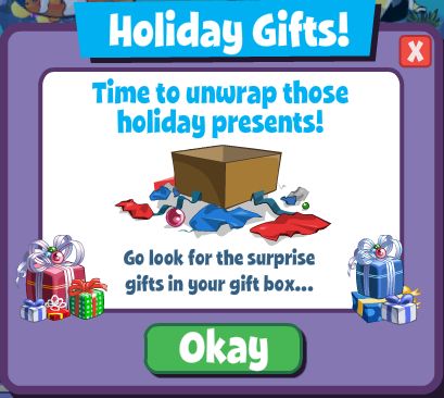 If you wonder how to open the FishVille presents – let me tell you that you can’t. When I logged in to my account I found out that all the boxes were already opened and all the gifts were waiting for me in the gift box. Fortunately, I saw the FishVille gift opening message you can see too in the picture and didn’t sell all the items. It would’ve been quite a waste!