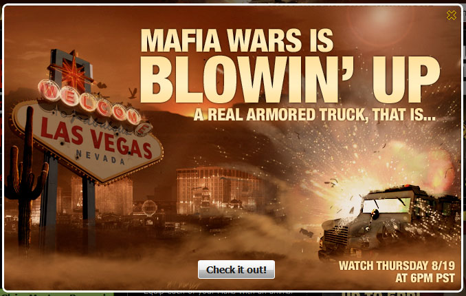 Well Zynga announced that the Mafia Wars Blowin’ Up a Real Armored Truck will happen on Thursday, August 19, at 6 PM PST. I guess they had to prepare things for the safety of everyone.