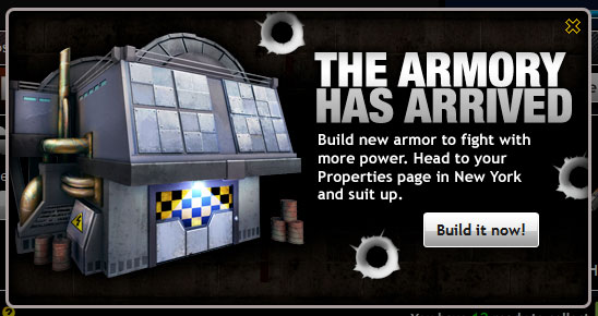 Now Mafia Wars players can make their own armors through the newest New York property. The Armory is right beside the Chop Shop and the Weapons Depot. Through the Armory you can make new Armors such as Plastic Legging, Mariner’s Suit, Pressure Suit, Sleek Torso Guard, Full Body Armor, MNU Suit, and a Power Armor.