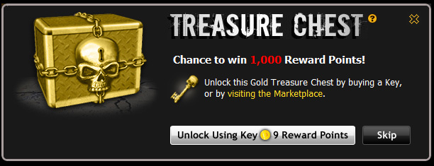 Aside from these items, you have the chance to receive up to 1,000 Reward Points. Gold Treasure Chest is a random drop from doing jobs. You need a Gold Treasure Chest Key to open it. This can be purchased at the Marketplace for 9 Reward Points. You can buy the Gold Treasure Chest Key for 5 Reward Points during an hourly sale.