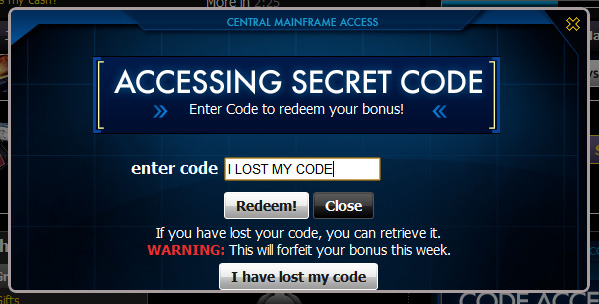 Click on the Enter Code button of the Central Mainframe. There you can retrieve another code if you lost your previous one. By doing so, you’ll forfeit your bonus for this week. You might not get this week’s bonus but at least you can access the Central Mainframe for the weeks to come.