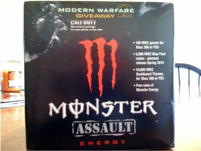 According to Shacknews, Monster Energy will start selling Call of Duty: Modern Warfare 2 themed energy drinks starting this October, which will give you access to amazing prizes. Like free copies of the first person shooter, access to the Call of Duty: Modern Warfare 2 Combat Training Experience and download codes for the map pack. Wait.. what?