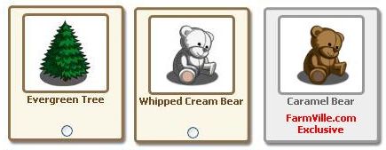 New FarmVille Gifts: Whipped Cream and Caramel Bear, Evergreen Tree
