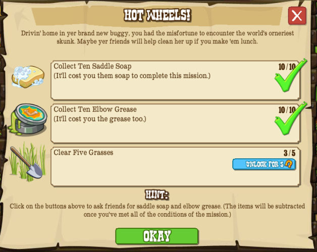 A new goal was launched in Frontierville over the weekend. The goal is called Hot Wheels! You are tasked to collect ten Saddle Soaps and ten Elbow Grease, as well as clear five Grasses.