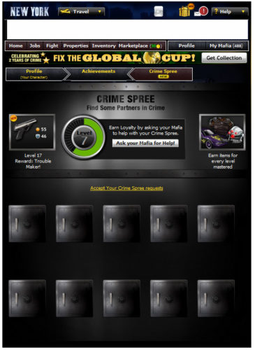 Now Zynga made it easier for people to go to the Crime Spree page. You’ll find a white Crime Spree icon on top of the Mafia Wars page, beside the Mail icon. Not only that, Zynga placed a new banner in-game to make it easier for players to ask for help for their own Crime Sprees.
