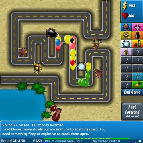 Back to Bloons Tower Defense 4, it’s worth noting that the game has changed a lot compared to the previous titles in the series. Now tower upgrades are unlocked on a tower-by-tower basis instead of the classic “all upgrades available”, there’s a hidden fifth super-upgrade for each tower once you reach a specific in-game rank and, well, since I already said it – there are in-game ranks for you to unlock!