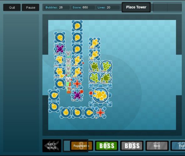 At the first glance, Bubble Tanks Tower Defense seems to be nothing but a “bubbles”-themed version of the classic Desktop Tower Defense game. But just seconds after playing you will realize that it’s a lot more than that! It starts slowly with upgradeable towers – there are three regular branches a tower can be upgraded to (each with it’s own next upgrades) plus a special upgrade that turns the tower into a boost, and there are a few to choose from. So yes, we can talk about tons of different possible strategies only from this point.