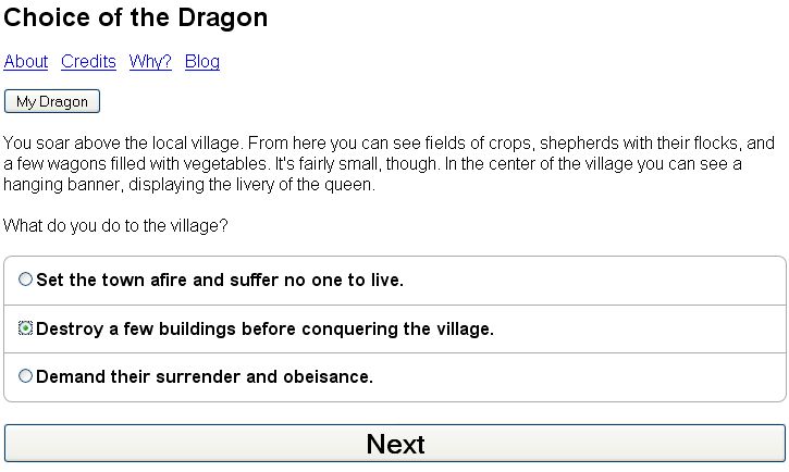 You start out your life as a dragon in Choice of the Dragon by answering questions who generate your stats. Then, you begin your adventure – and adventure of might and honor, of battles and, above all, tough decisions to make: will you kidnap a princess or a prince? Will you let your foes live or kill them instantly? What will you do?
