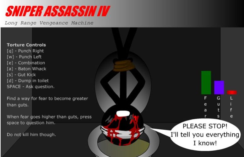 Level 8 (code: APPLE): Here it’s all about the skill: you only have to shoot the arms and the legs, it’s all up for you to do it right. Good luck (or simply skip to the next level!)