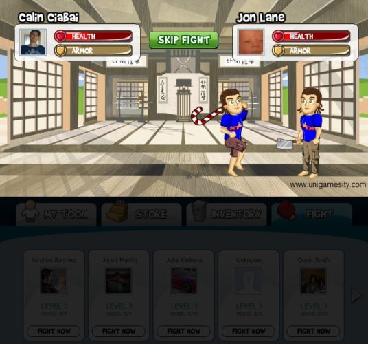 Basically, the concept is the same in Killer Toon: you create your own avatar and customize it a little bit (there are very few customization options available so eventually they’ll all look the same) and start fighting against other people. Unlike MyBrute which was rather random regarding your skills and weapons, Killer Toon is a bit more organized and logical: you gain experience for fighting and you can purchase your own goodies: better weapons, armor and different sets of clothes. So you shouldn’t be too frustrated if you lose: it’s your fault for not getting the best items, after all!