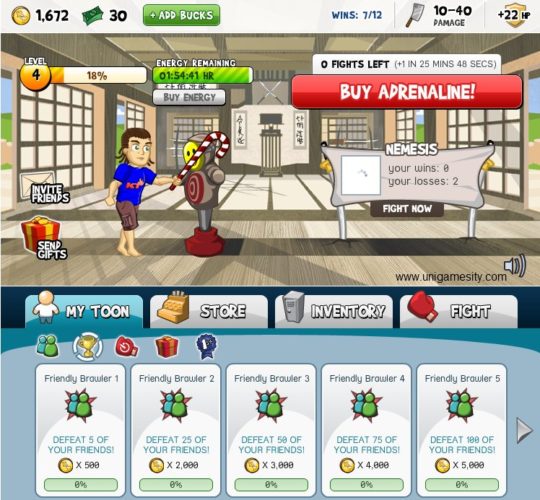 The game itself is only briefly described by Toy Studio: “Create a toon and fight your friends on Facebook!“ but you really don’t need too many details to know what this game’s about, especially if you’ve played the hit of the internet a while back, My Brute.