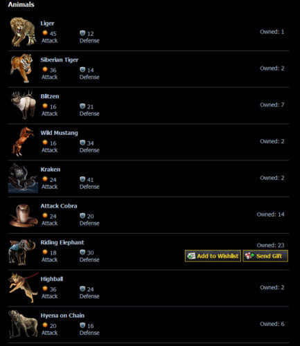 There are Animals up on sale with a price tag of 20 Reward Points. These are the Chinese Tiger (26 Attack 48 Defense), Howler Monkey (20 Attack 37 Defense), Snow Leopard (37 Attack 25 Defense), Wild Mustang (16 Attack 34 Defense), and Pair of Pet Tigers (28 Attack 12 Defense).