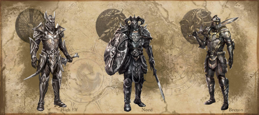 The concepts show melee classes gear for High Elf, Nord and Breton races. The heavy plate armors are not identified but all of them have a dark touch and share the same line style.