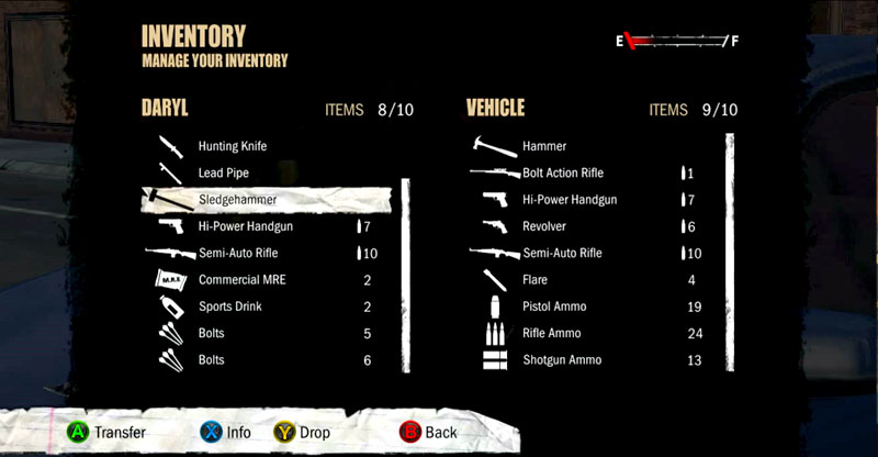 Space is very limited in Survival Instincts, even your car can only carry 10 slots, (fantastic!) What you should do is: drop weapons that you never use and store most of the items in your car. Why? How do you want to collect ammo, food and fuel supplies, even new weapons, if you start a mission with half of your inventory full? Oh, and if you’re afraid that your companions might die during their searches, then don’t give them a good weapon, if they die, you’ll never put your hands on it again.