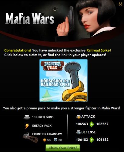 Once you’ve reached the right level, you’ll be rewarded with the Railroad Spike for the Frontierville Horseshoe Pit. Not only that you’ll also receive Mafia Wars Promo Pack. It contains ten Hired Guns, an Energy Pack, and a Frontier Chainsaw. If you already have a Frontier Chainsaw from the previous Mafia Wars/Frontierville promo then you’ll find two in your inventory.