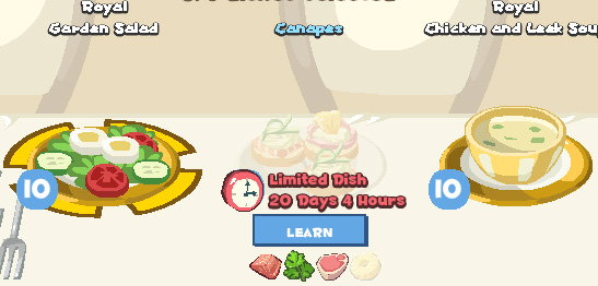 The Starter Dish is Canapes, which is a limited time only dish. You have to learn it within the time limit because when the time expires, it will disappear. As of today, you still have twenty days left to learn it. The Canapes dish needs four ingredients, which are Salmon, Coriander, Pork, and Pineapple.