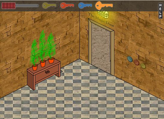 8. Note that under the colored circles near the door, there are some dots. Match the keys with the color and use them with these dots. After using the three keys, a keyhole will appear on the door – use the orange key with it and you’re out!