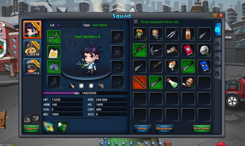 As your agent, yourself, level up, you’ll be able to upgrade your buildings and your chances to get better characters will increase. Jenny’s Dive is your tavern, where new characters can be recruited. Common or white characters are the weakest in game; green are called the experienced ones; orange are quite good and are nominated as veterans and finally, the most powerful are the expert, shown in purple. Note that, whenever you obtain a new squad mate you’ll need to train him, transfer experience from another character in Gainz Fitness or practice in lower level areas in order to manually level up. If you bring this low level character to high level zones, he/she will immediately die and you’ll be fighting with just two units.